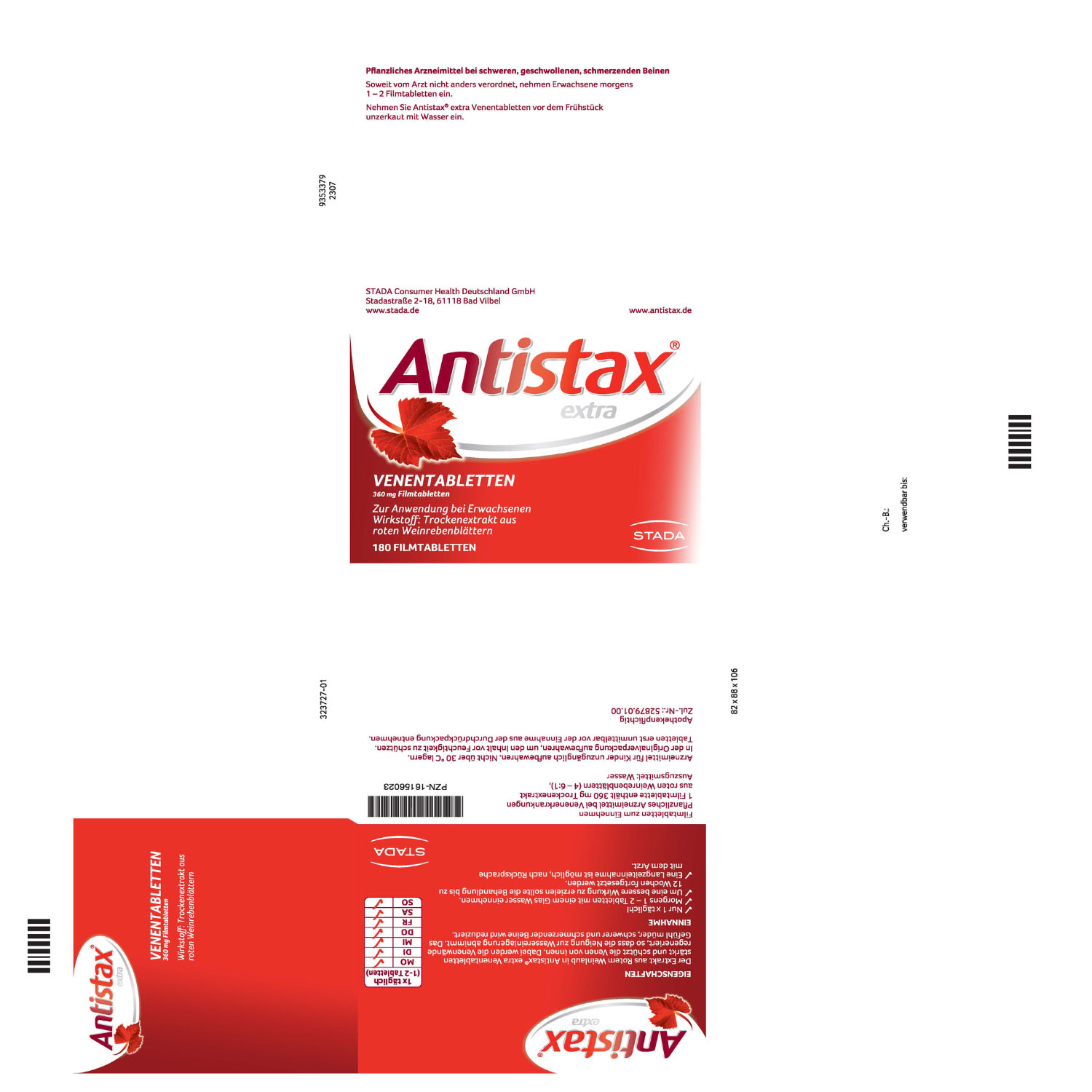 Antistax® extra Venentabletten mit der medizinischen Kraft des Roten Weinlaubs lindern geschwollene und schmerzende Beine. Der Wirkstoff setzt genau dort an, wo der Schaden entsteht: an der Venenwand. Die Venenwände werden nachweislich repariert, gestärkt und geschützt. Der Extrakt des Roten Weinlaubs besitzt einen hohen Gehalt an sekundären Pflanzenstoffen, den sogenannten Flavonoiden. Durch die gezielte Wirkung in der Vene werden: