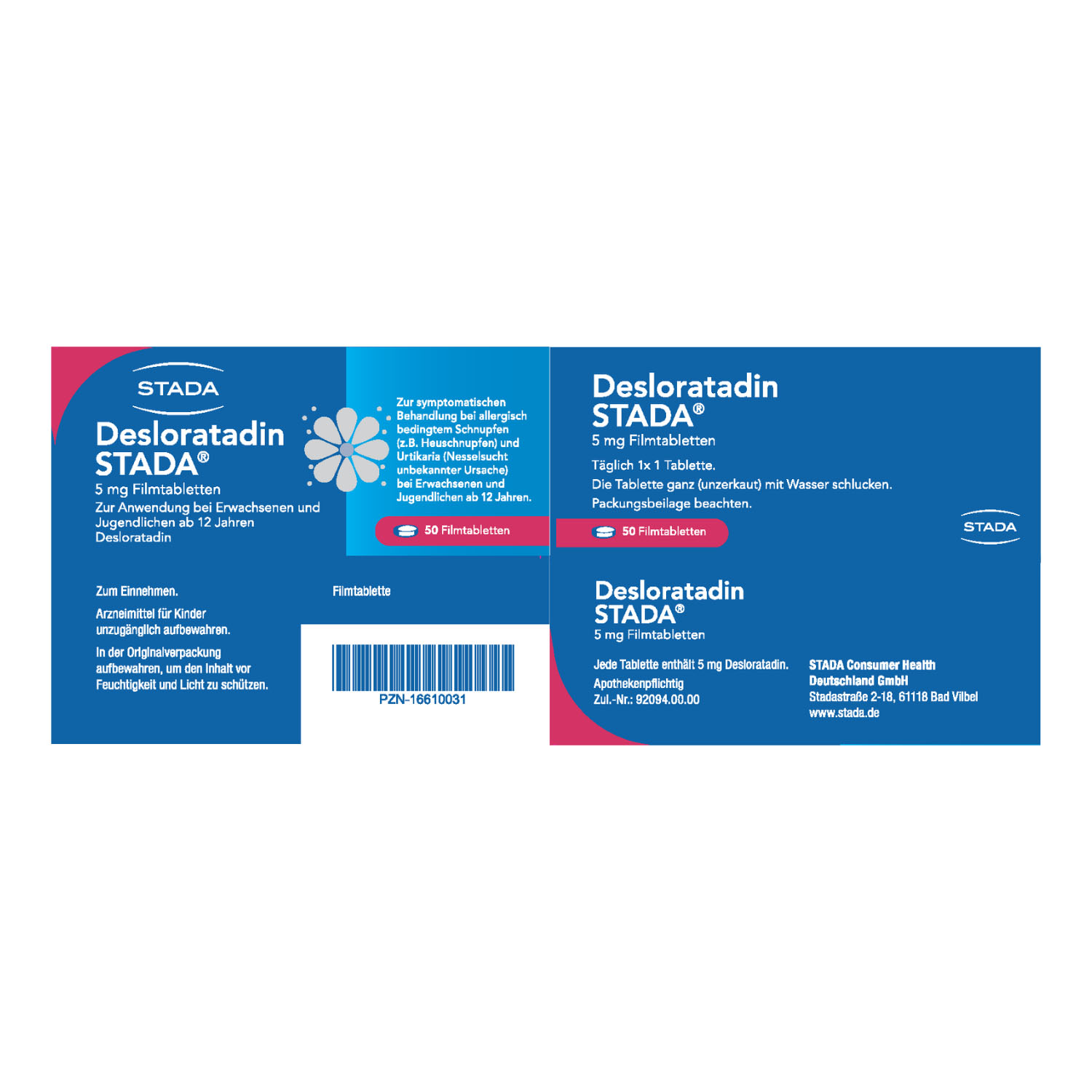 Anwendungsgebiete: Desloratadin STADA® bessert die Symptome bei allergischer Rhinitis (durch eine Allergie hervorgerufene Entzündung der Nasengänge, beispielsweise Heuschnupfen oder Hausstaubmilben-Allergie). Diese Symptome beinhalten Niesen, laufende oder juckende Nase, Juckreiz am Gaumen und juckende, gerötete oder tränende Augen. Es wird ebenfalls angewendet zur Besserung der Symptome bei Urtikaria (ein durch eine Allergie hervorgerufener Hautzustand). Diese Symptome beinhalten Juckreiz und Quaddeln. Die Besserung dieser Symptome hält einen ganzen Tag an und hilft Ihnen, Ihre normalen Alltagsaktivitäten wieder aufzunehmen und Ihren Schlaf wiederzufinden. Wenn Sie sich nach 10 Tagen nicht besser oder gar schlechter fühlen, wenden Sie sich an Ihren Arzt.