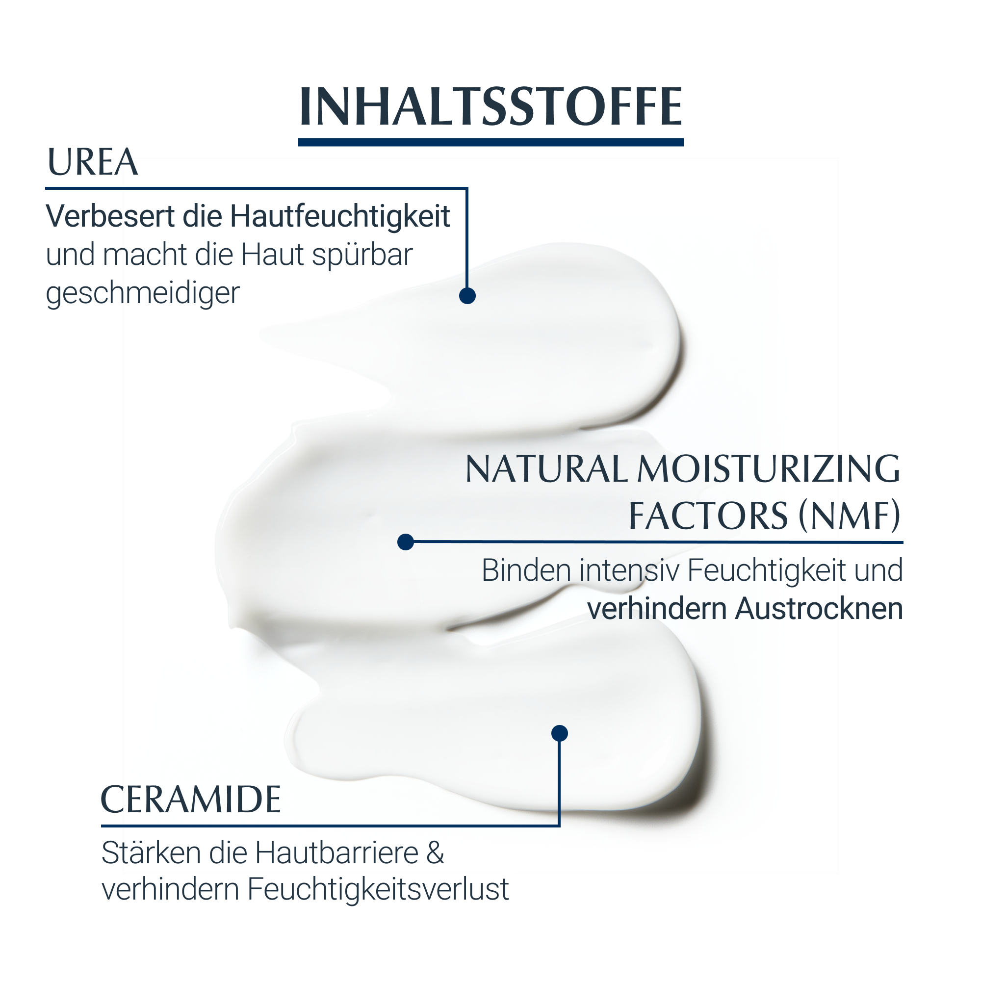 Der 3-fache Feuchtigkeits-Komplex in der Körpercreme verbessert die Feuchtigkeitsbindung der Haut und so wird der Feuchtigkeitsgehalt in den oberen Hautschichten deutlich erhöht. Dies wird durch die Kombination des Wirkstoffs Urea mit natürlichen Feuchthaltefaktoren erreicht. Zugleich stärken Ceramide die hauteigene Barriere, schützen und pflegen intensiv. Als Öl-in-Wasser Emulsion zieht die leichte Lotion schnell ein, macht die Haut glatt sowie geschmeidig und stärkt die schützende Hautbarriere. Die Formel ist ohne Duftstoffe und mikroplastikfrei gemäß UNEP-Definition.