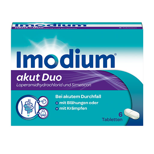 Anwendungsgebiet: Symptomatische Behandlung akuter Durchfälle bei Erwachsenen u. Jugendlichen ab 12 Jahren, wenn gleichzeitig auch Bauchkrämpfe, ein aufgeblähter Bauch u. Blähungen auftreten. Loperamidhydrochlorid vermindert den Durchfall durch Verlangsamung der gesteigerten Darmaktivität. Zusätzlich erhöht es die Aufnahme v. Wasser u. Salzen aus dem Darm. Simeticon lässt die Gasblasen, die Krämpfe u. Blähungen verursachen, im Darm zerfallen.