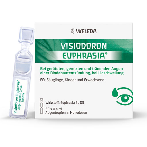 Reizzustände der Augenbindehaut gehören zu den häufigsten Augenproblemen. Der in Visiodoron Euphrasia Augentropfen enthaltene Heilpflanzenauszug aus Augentrost wirkt lindernd bei tränenden und geröteten Augen, beruhigt unangenehmes Brennen und Jucken und lässt leichte, nicht–infektiöse Bindehautentzündungen rasch abklingen. Nach Rücksprache mit dem Arzt sind sie auch für die langfristige Anwendung geeignet, zum Beispiel während der Allergiesaison. Visiodoron Euphrasia Augentropfen von Weleda sind frei von Konservierungsstoffen und auch für Kontaktlinsenträger geeignet.