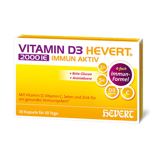 Die Einnahme von Vitamin D3 Hevert 2000 IE Immun Aktiv hilft dabei, den täglichen Bedarf an Vitamin C, Vitamin D, Selen und Zink zu decken. Mit nur 1 Kapsel am Tag sind Jugendliche über 15 Jahren und Erwachsene optimal versorgt und das Immunsystem wird unterstützt. Vitamin D3 Hevert 2000 IE Immun Aktiv wird in Deutschland hergestellt, ist vegetarisch, zucker-, laktose- und glutenfrei sowie frei von Farb- und Konservierungsstoffen.
