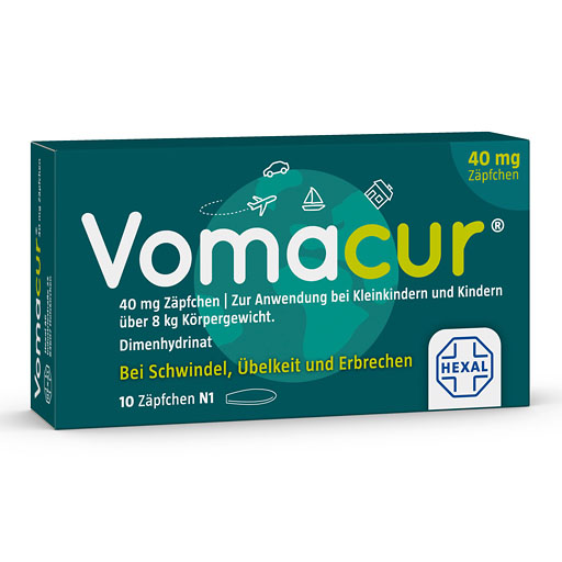 Vomacur® 40 mg Zäpfchen sind zur Behandlung von Reisekrankheit, Übelkeit, Schwindel und Erbrechen bei Kleinkindern und Kindern über 8 kg Körpergewicht geeignet. Bei bekannter Neigung zu Reiseübelkeit kann das Arzneimittel auch vorbeugend eingenommen werden und lindert das flaue Gefühl in der Magengegend, dank des bewährten Wirkstoffs Dimenhydrinat. Vomacur® 40 mg Zäpfchen sind bei richtiger Dosierung verträglich und auch für Kleinkinder über 8 kg Körpergewicht geeignet. Bitte halten Sie sich genau an die Dosierung, weil Überdosierungen insbesondere für Kleinkinder schnell gefährlich werden können.